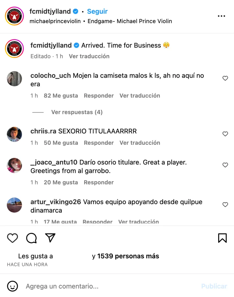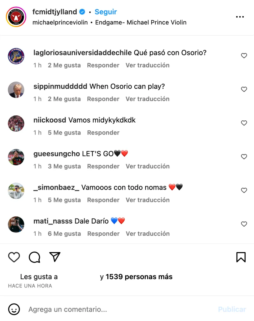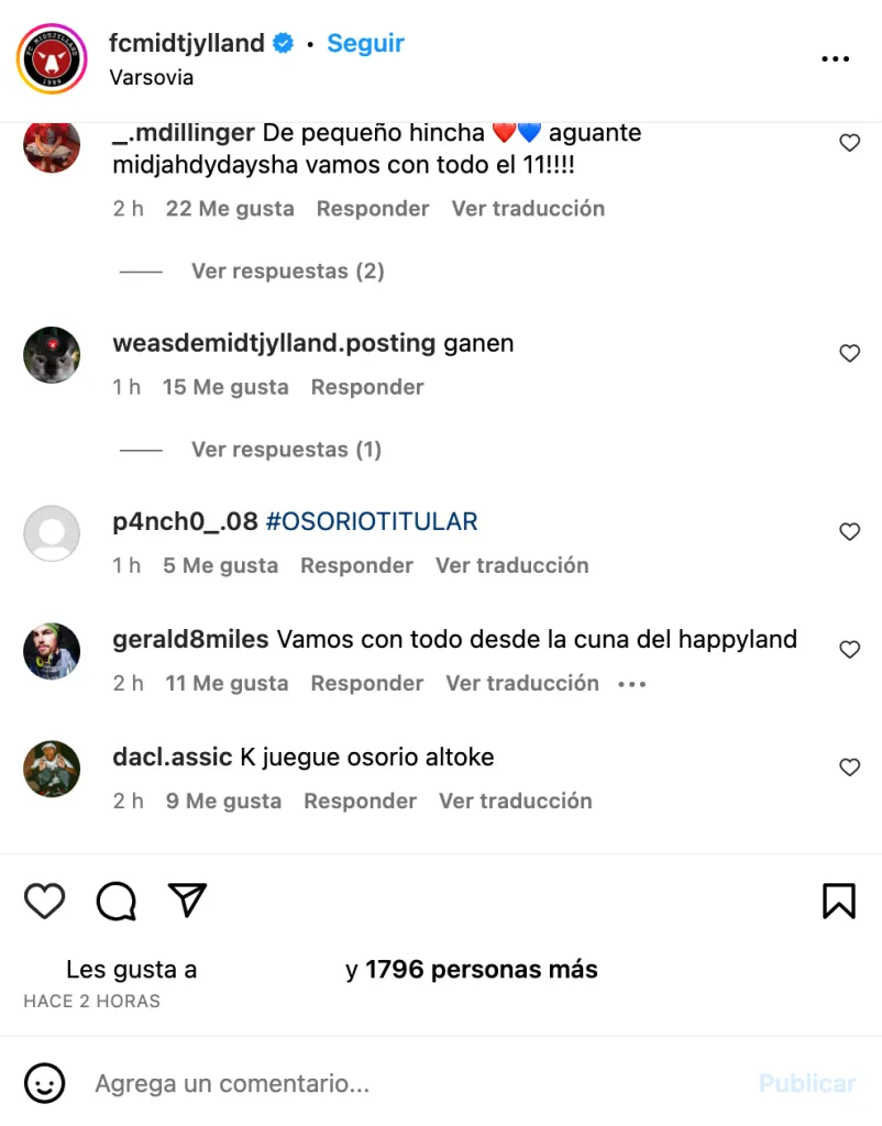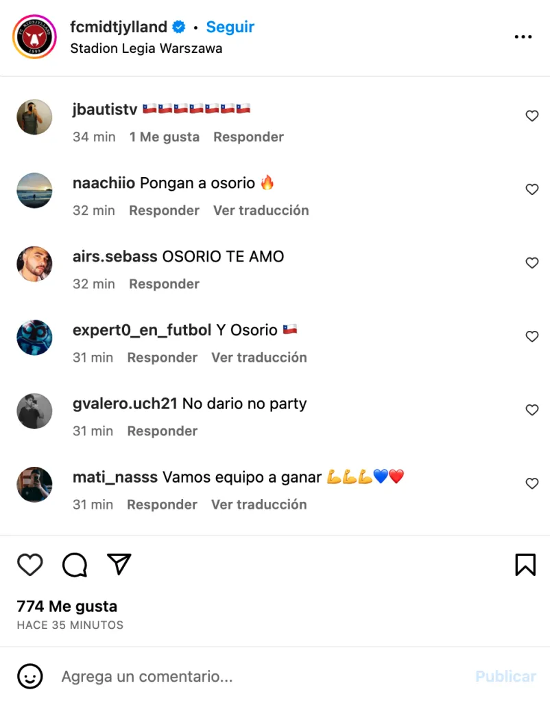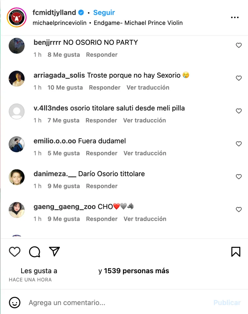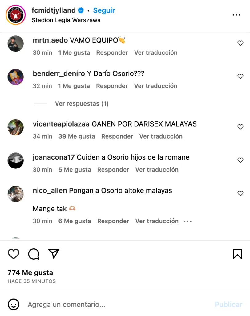 En la formación contra el Legia Varsovia, la gente los alentó. “Del midtjyksdlslsk desde la cuna”, “Ganen por Darío Osorio”, “Cuiden a Osorio hijos de la romane” y “GANEN POR DARISEX MALAYAS”, comentaron.