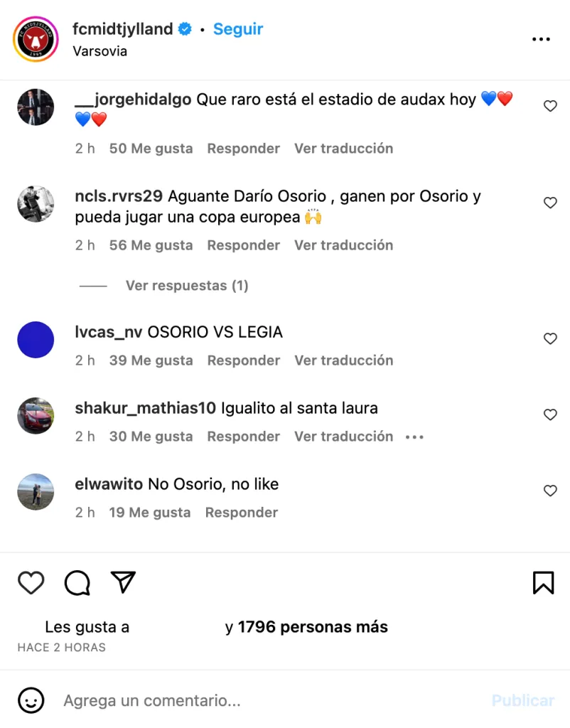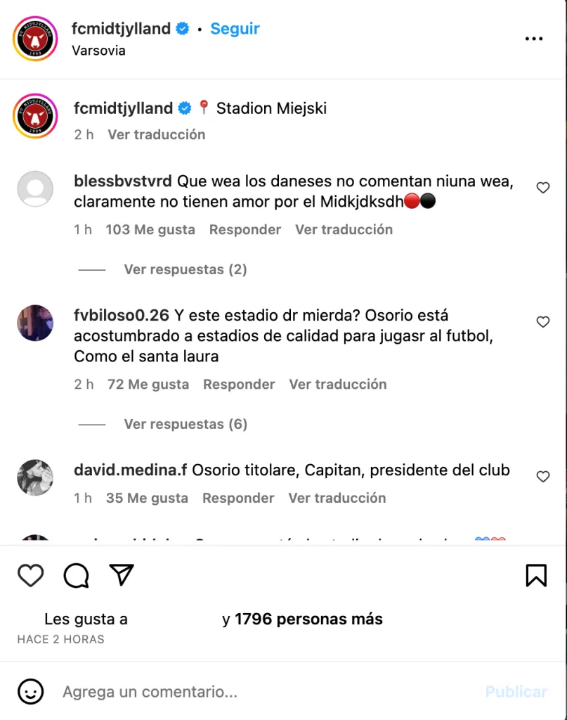 Este jueves, por ejemplo, el Midtjylland enfrentaba al Legia Varsovia por la UEFA Conference League. Y cuando compartieron imágenes del estadio, comentaron. “Y este estadio de mierda? Osorio está acostumbrado a estadios de calidad para jugar al futbol, Como el santa laura”, o “Que raro está el estadio de audax hoy” y emojis azul y rojo.