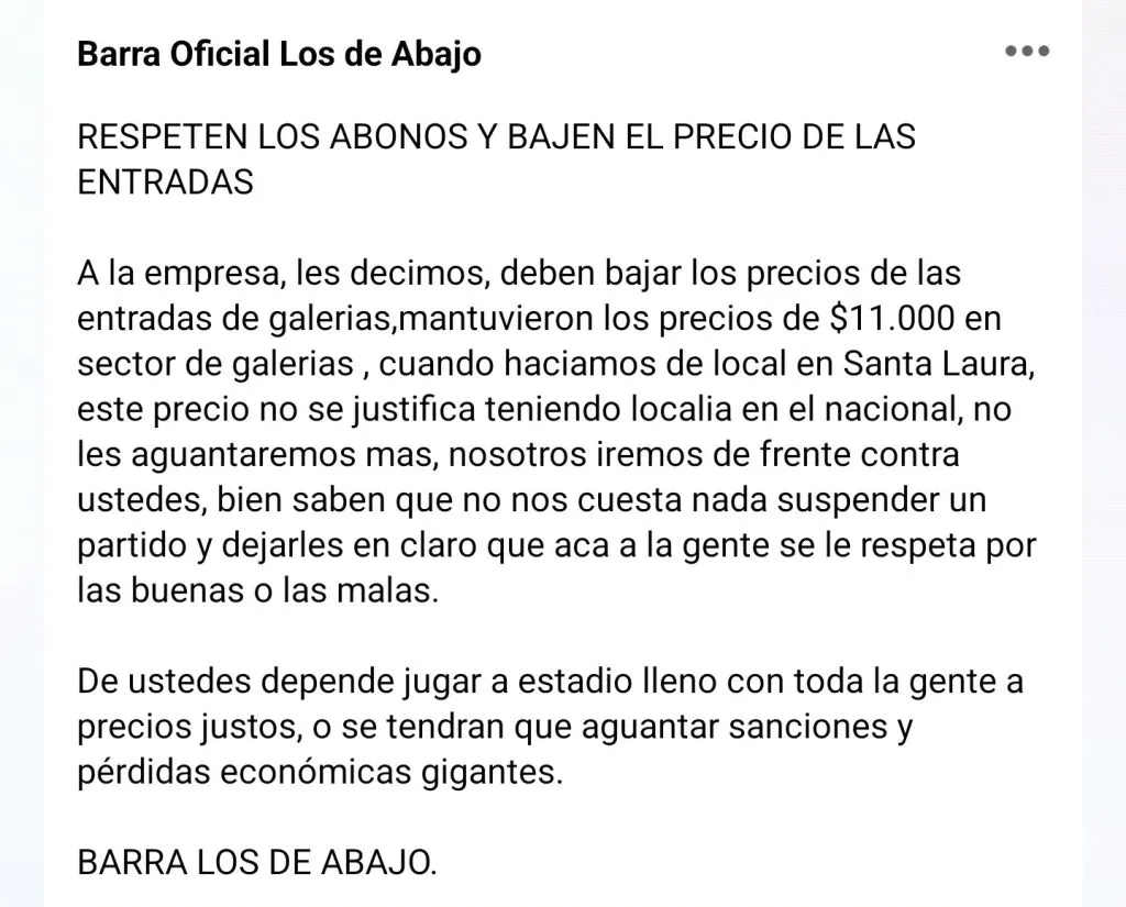 “A la empresa, les decimos, deben bajar los precios de las entradas de galerías, mantuvieron los precios de $11.000 en sector de galerías cuando hacíamos de local en Santa Laura, pero este precio no se justifica teniendo localía en el Nacional”, explican.
