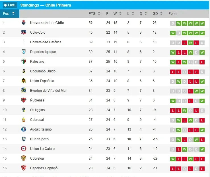 La derrota de Deportes Iquique por 2-0 ante Palestino, hace que la U tenga una distancia de 13 puntos con los del norte, por lo que la victoria del equipo de Gustavo Álvarez les hace sacar la ventaja necesaria para asegurar uno de los tres cupos que tiene Chile.