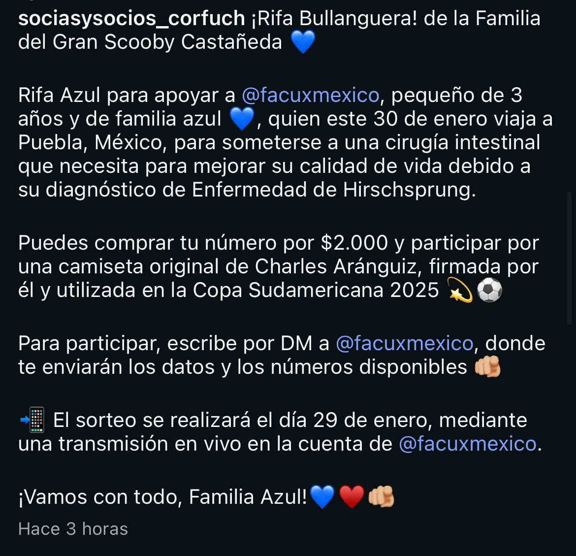 Según explican en el sitio de los Socios Corfuch, “el 30 de enero viaja a Puebla, México, para someterse a una cirugía intestinal que necesita para mejorar su calidad de vida debido a su diagnóstico de Enfermedad de Hirschsprung”.