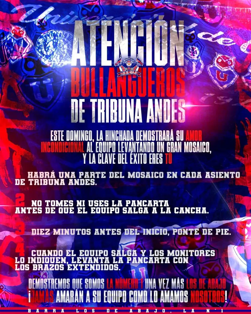 “Les recordamos que este domingo deben ser 45 mil camisetas azules, la bullanguera, la de la barra, poleras azules, pero nada que no sea de otro color”, explican en sus redes sociales.