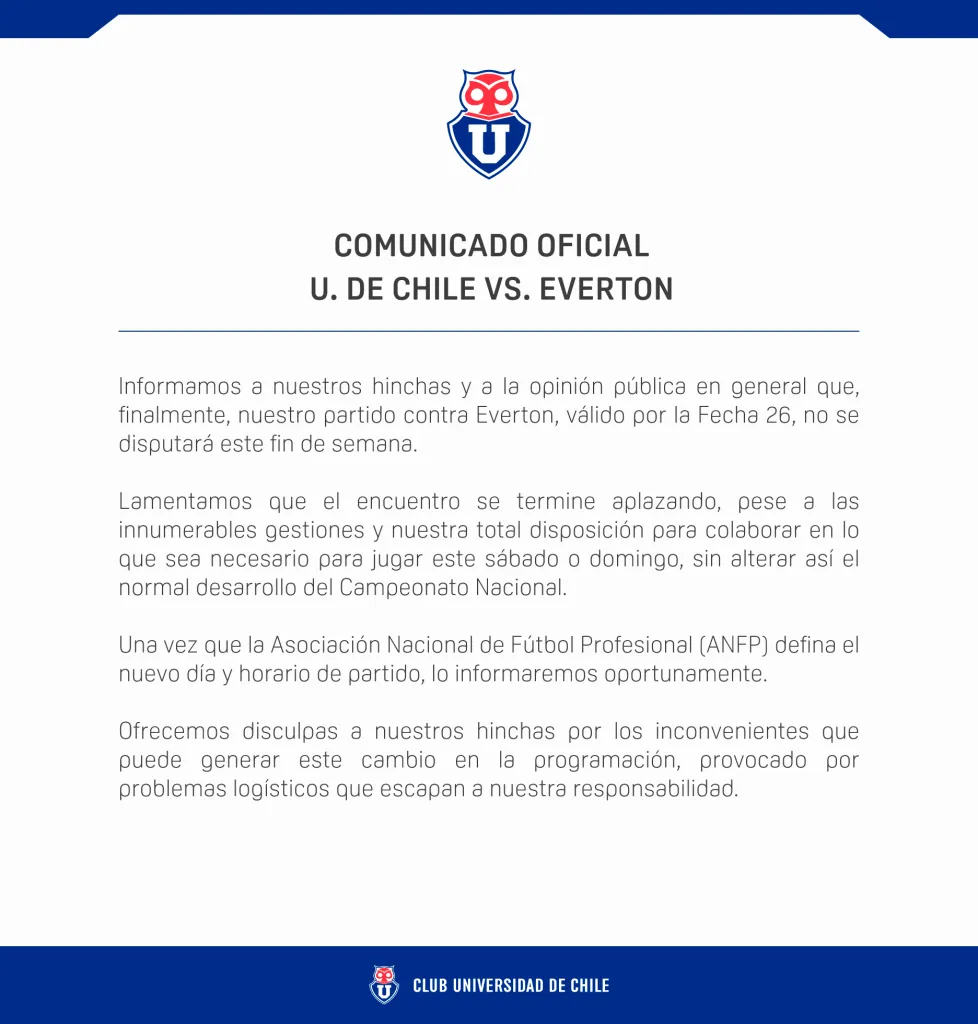 Por la tarde de este 5 de octubre, Universidad de Chile emitió un comunicado para dar algo de información a sus hinchas. “Finalmente nuestro partido ante Everton, válido por la fecha 26, no se disputará este fin de semana”, dice el primer párrafo del documento.