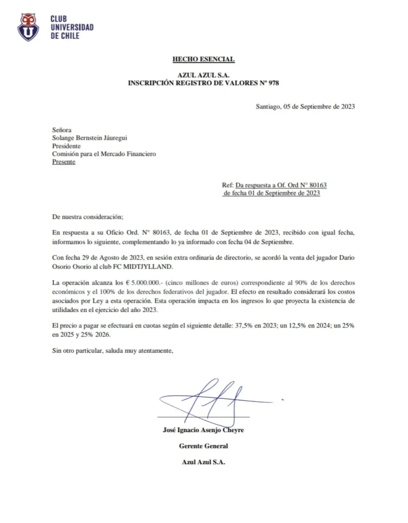 O sea, Universidad de Chile queda con el 10 por ciento de la carta para una futura transferencia de Osorio. Y eso no fue todo: “El efecto en resultado considerará los costos asociados por Ley a esta operación, que impacta en los ingresos. Eso proyecta la existencia de utilidades en el ejercicio del año 2023”, dice también el hecho esencial, que incluye el itinerario de los pagos del cuadro danés.