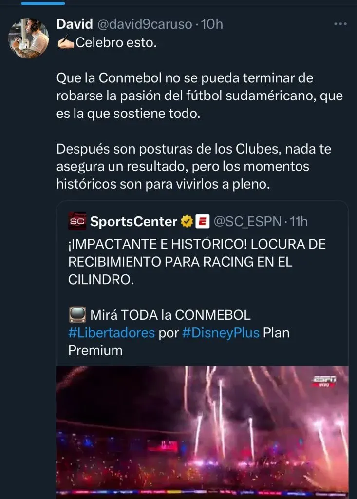 “La postura del club es no hacer nada por fuera de las reglas de la Conmebol. Evitar multas y jugar a puertas cerradas a futuro”, explicó David Caruso en sus redes sociales.