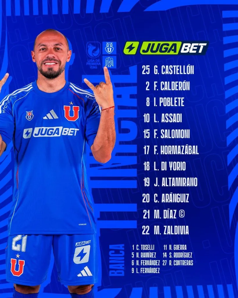 Con esto, la formación de la U será con Gabriel Castellón; Fabián Hormazábal, Franco Calderón, Matías Zaldivia, Felipe Salomoni en la defensa; Israel Poblete, Marcelo Díaz, Charles Aránguiz en los volantes; Javier Altamirano, Lucas Di Yorio y Lucas Assadi en la delantera.