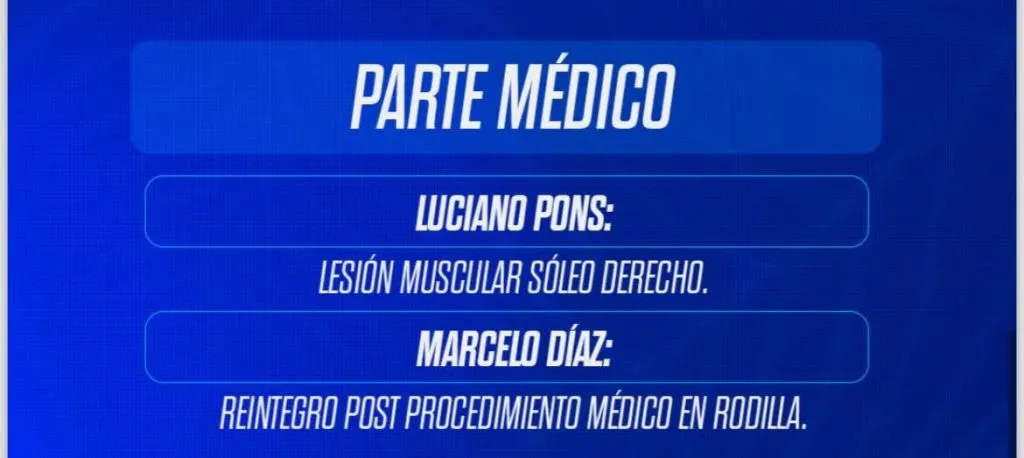 En el documento apareció el nombre de Marcelo Díaz, donde detallan que está en un “reintegro deportivo post procedimiento médico en la rodilla”, por lo que sigue en evolución.