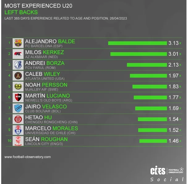 Un ranking que es liderado por Alejadro Balde (Barcelona) y le siguen Milos Kerkez (AZ Alkmaar) y Andei Borza (FCV Farul).