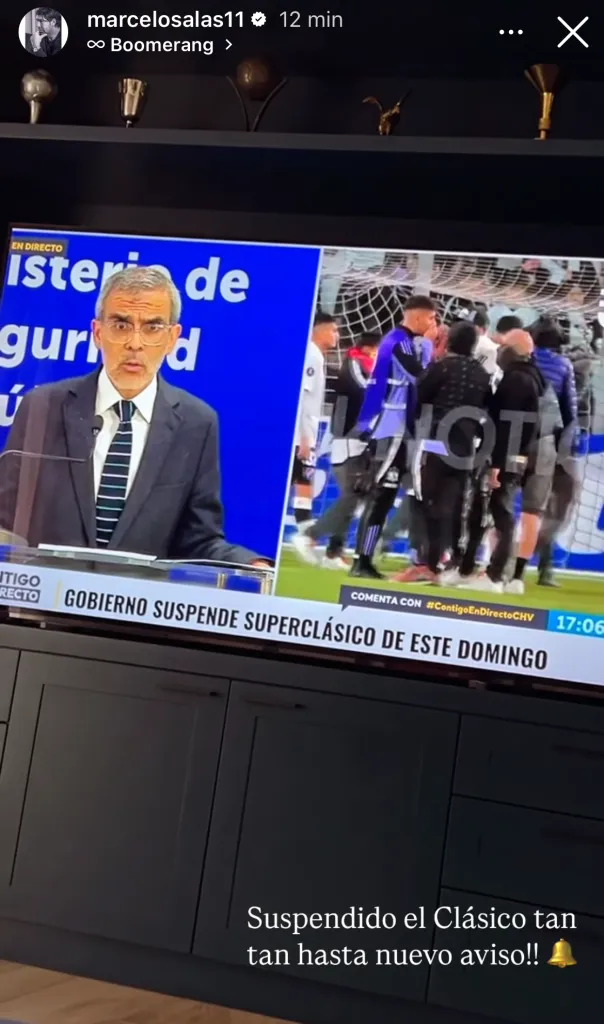 “Suspendido en Clásico, tan tan hasta nuevo aviso”, publicó Salas en sus plataformas digitales, donde hacer ver la molesta por la situación en que está el fútbol chileno.