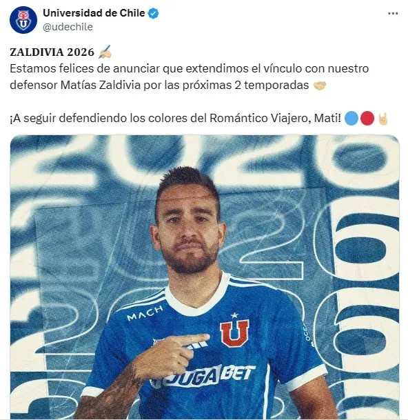 “Estamos felices de anunciar que extendimos el vínculo con nuestro defensor Matías Zaldivia por las próximas 2 temporadas”, destacó Universidad de Chile en sus redes sociales.