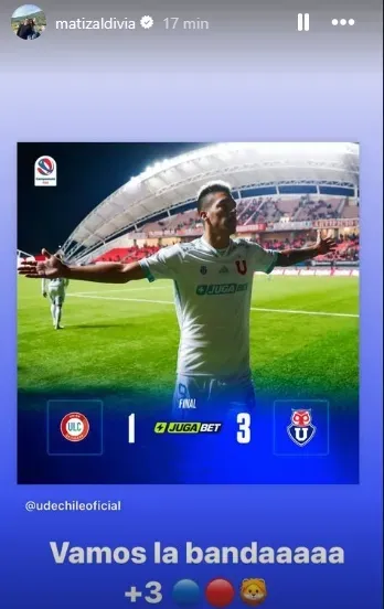 Es por esto que ocupó sus redes sociales para celebrar con el equipo, donde apuntó una fotografía del festejo de Leandro Fernandez: “Vamos la banda + 3”, lo que acompañó con los colores azul y rojo, además de un león.