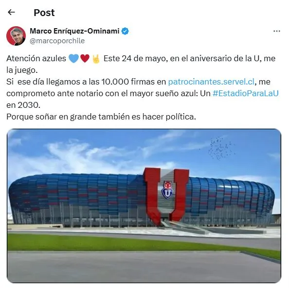 “Atención azules. Este 24 de mayo, en el aniversario de la U, me la juego. Si ese día llegamos a las 10.000 firmas me comprometo ante notario con el mayor sueño azul: Un estadio Para la U en 2030″, avisó el político.
