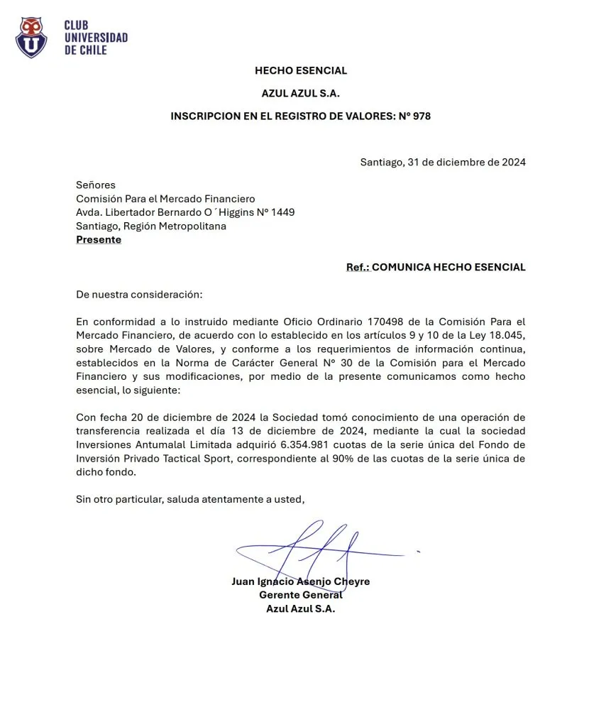 “Con fecha 20 de diciembre de 2024 la Sociedad tomó conocimiento de una operación de transferencia realizada el día 13 de diciembre de 2024, mediante la cual la sociedad inversiones Antumalal Limitada adquirió 6.354.981 cuotas de la serie única del Fondo de Inversiones Privado Tactical Sport, correspondiente al 90% de las cuotas de la serie única de dicho fondo”, detallan.