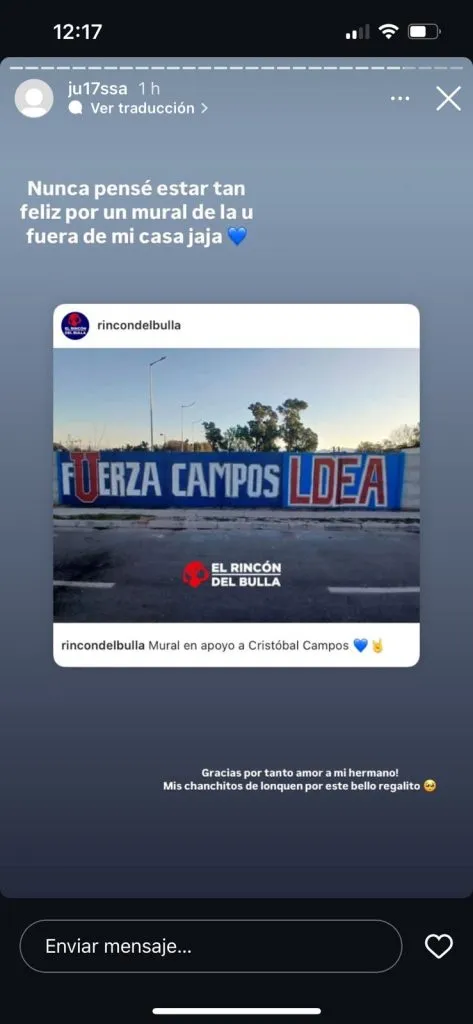 “Nunca pensé estar tan feliz por un mural de la U fuera de mi casa”, puso la hermana de Cristóbal Campos, Julisa, reconocida hincha de Colo Colo, quien, además de subir la foto de la dedicatoria, agradeció el gesto.
