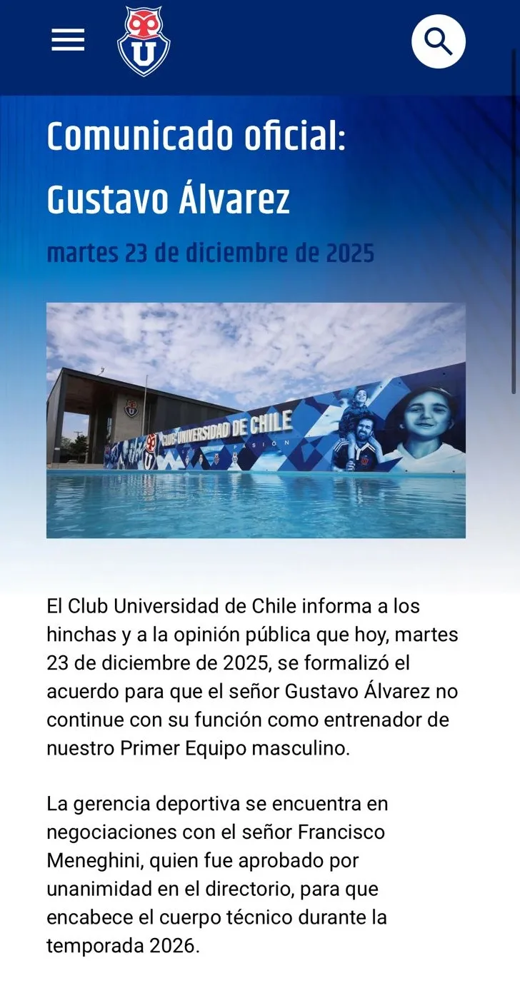 “El Club Universidad de Chile informa a los hinchas y a la opinión pública que hoy, martes 23 de diciembre de 2025, se formalizó el acuerdo para que el señor Gustavo Álvarez no continúe con su función como entrenador de nuestro Primer Equipo masculino”, explicaron.