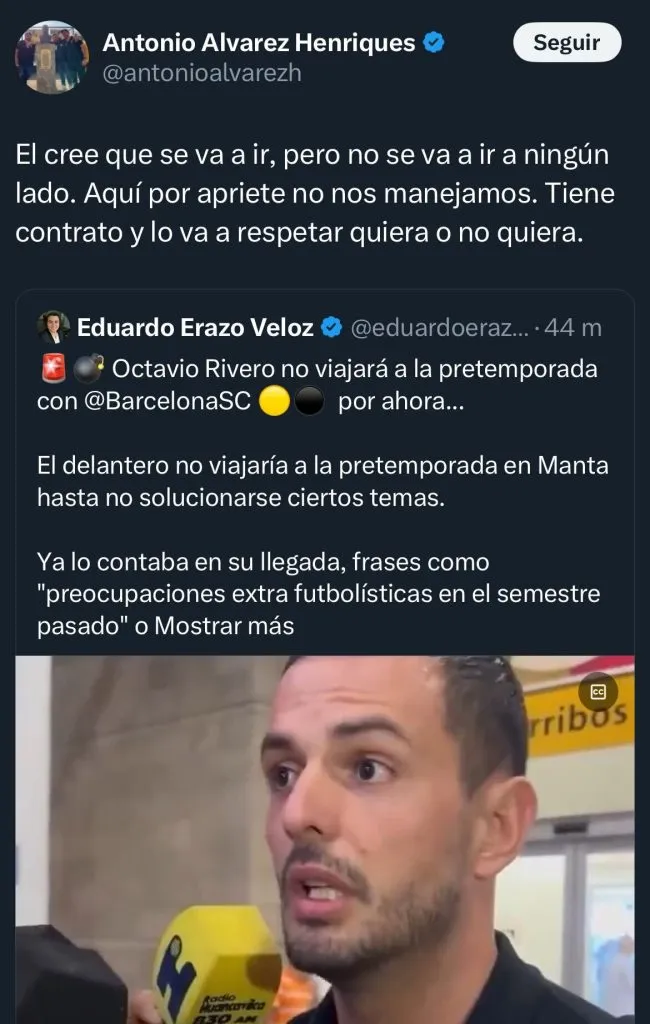 “Él cree que se va a ir, pero no se va a ir a ningún lado. Aquí por apriete no nos manejamos. Tiene contrato y lo va a respetar quiera o no quiera”, detallan los medios ecuatorianos.