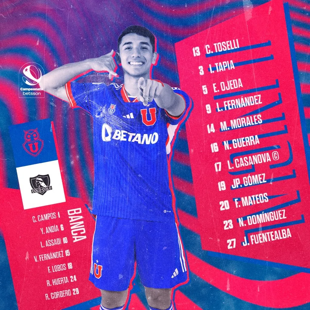 De boca del mismo DT del Chuncho, en conversación con TNT Sports en la previa del duelo, la U formará con Cristopher Toselli en el arco; Luis Casanova, Nery Domínguez e Ignacio Tapia en defensa; Juan Pablo Gómez, Emmanuel Ojeda, Federico Mateos, Marcelo Morales y Jeison Fuentealba en la zona de volantes; Leandro Fernández y Nicolás Guerra en ataque.
