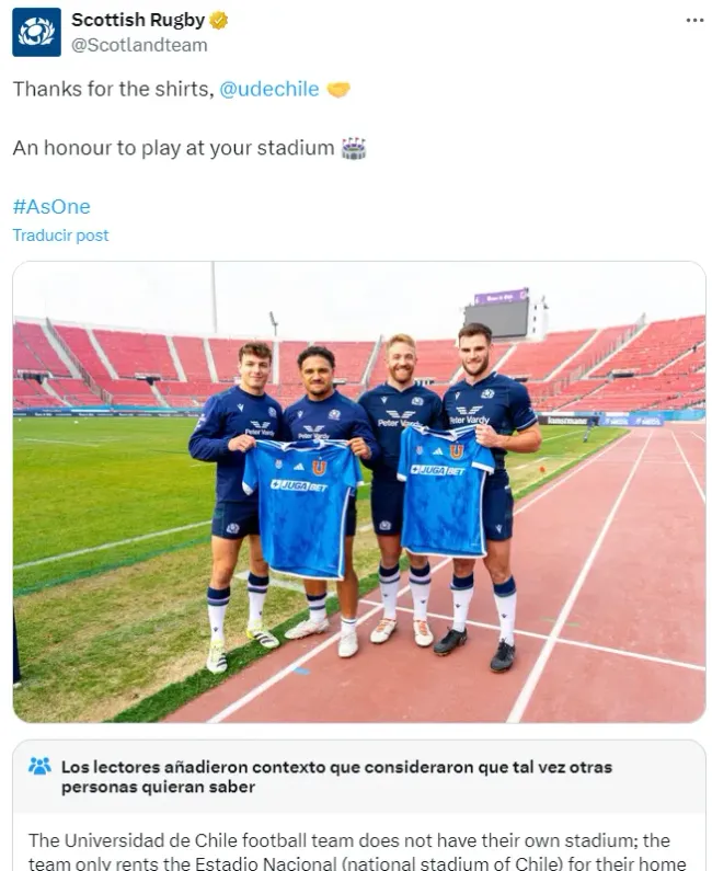 Desde la misma selección escocesa de rugby reaccionaron agradeciendo el regalo y sumándose a la fanaticada de Universidad de Chile. Eso sí, un pequeño mal entendido abre nuevamente la vieja herida del Chuncho.