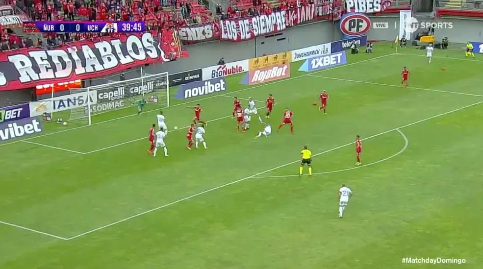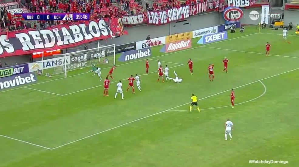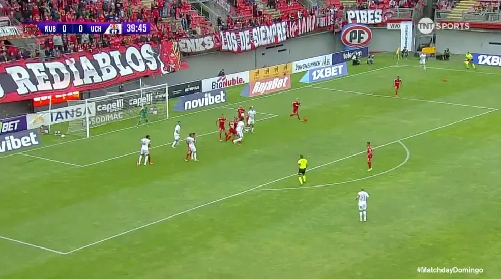 Ñublense tuvo las primeras acciones de alto peligro, pese a que la U llegaba más. Se podía decir que los de Chillán tenían aproximaciones cualitativamente mejores, aunque cuantitativamente, el Bulla se imponía.