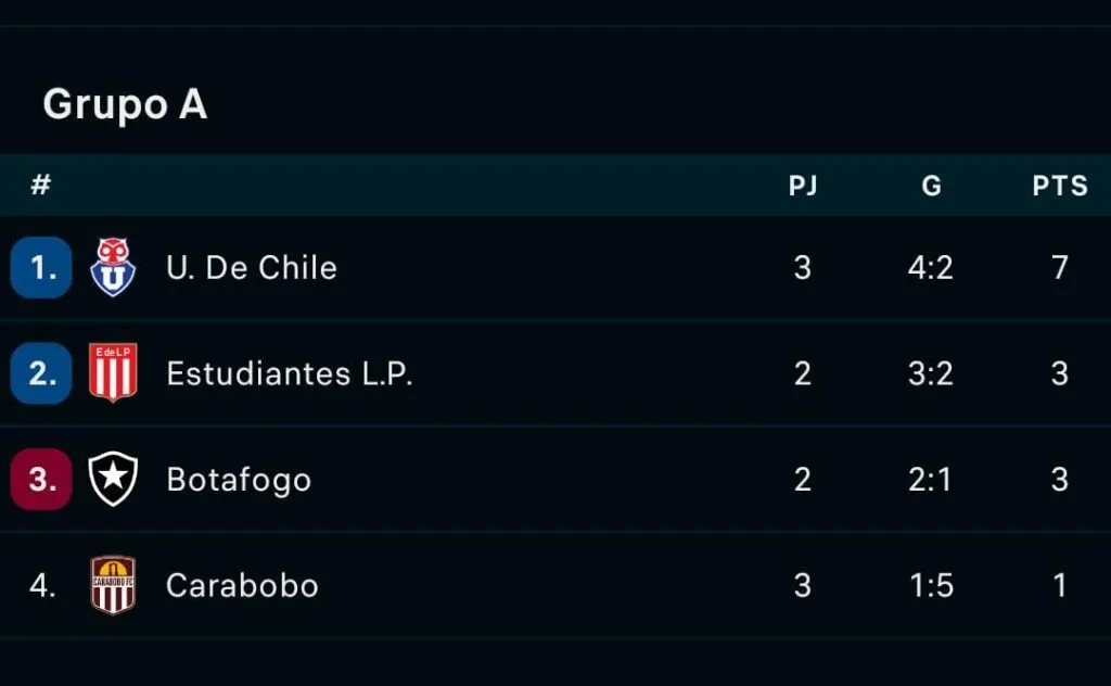 Tras los azules, figuran los elencos que se medirán ahora en La Plata, cerrando la fecha. Tanto Estudiantes como Botafogo tienen tres puntos, ya que ambos le ganaron sus partidos a Carabobo.
