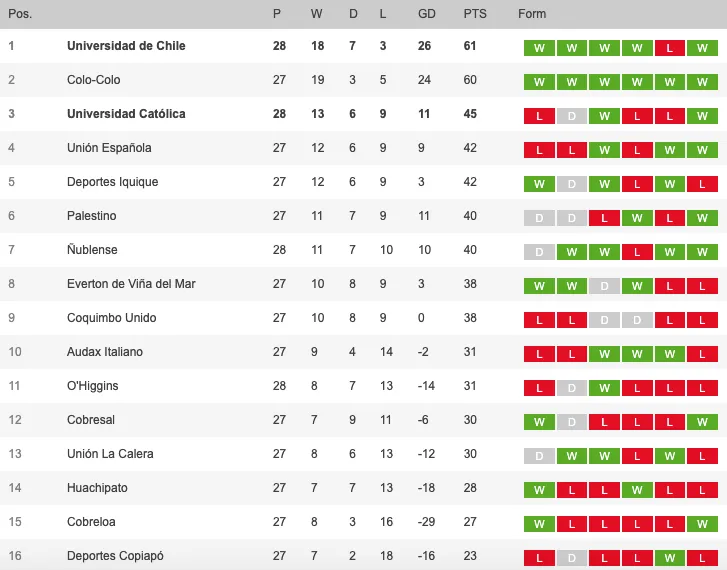 Por su parte, Católica se enreda y sólo tiene tres de ventaja frente a sus más próximos perseguidores, Unión Española y Palestino, quienes aún tienen un partido por jugar.