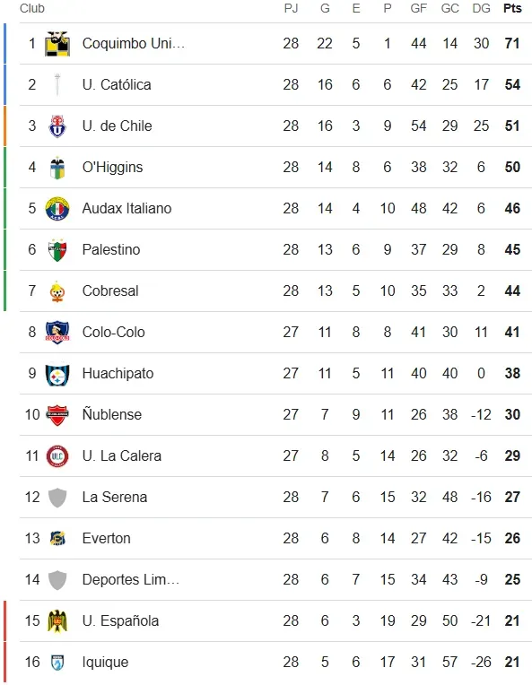 Por su parte, O’Higgins se queda con 50 puntos ahora en el cuarto lugar. Si bien tienen opciones matemáticas para el Chile 2, Los Celestes ahora necesitan que se caigan la UC y la U.