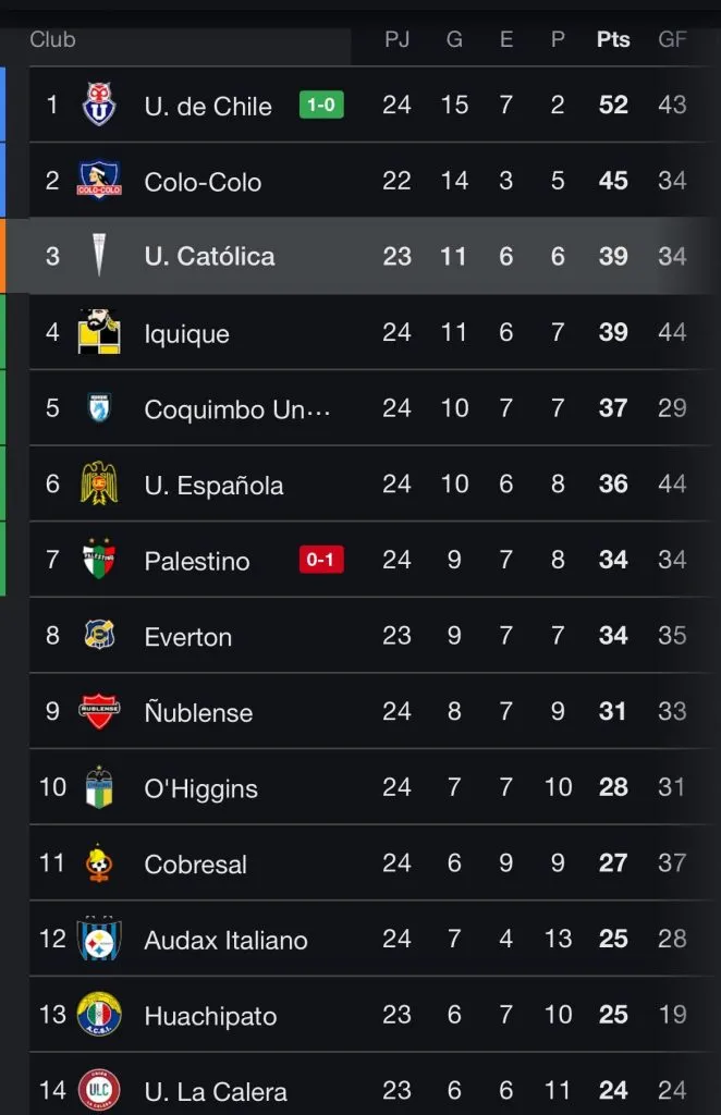Con el triunfo quedaron a siete puntos sobre Colo Colo, que está en el segundo lugar, pero con dos encuentros menos, ante Huachipato y Universidad Católica, que le pueden complicar el panorama hasta el final.