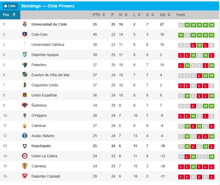 La tabla de posiciones tiene un claro líder en el Campeonato Nacional, donde Universidad de Chile sigue estirando su ventaja en el primer lugar de la clasificación.