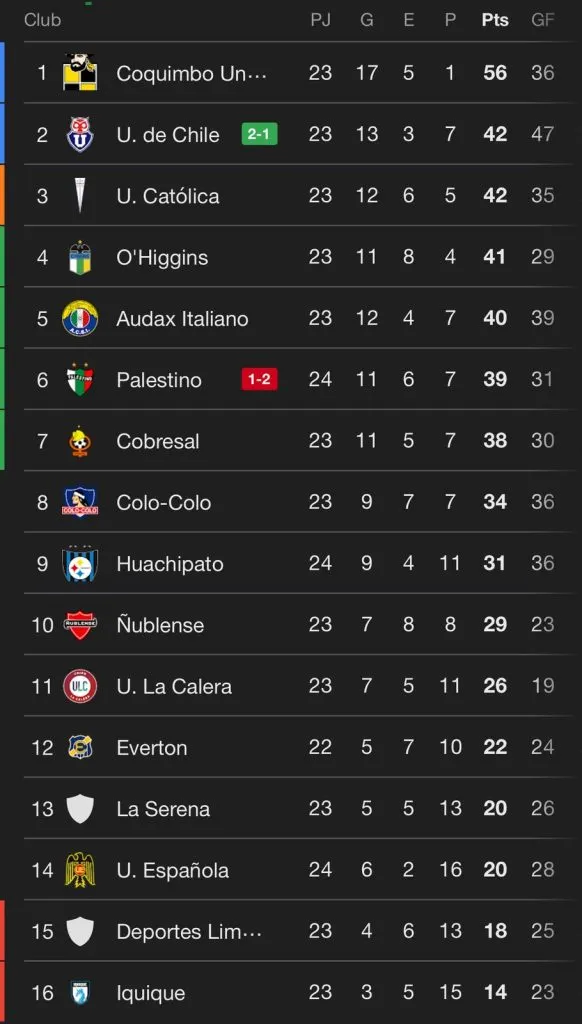 Con el triunfo de Universidad de Chile por 2-1 ante Palestino, los azules vuelven a ser los escoltas de Coquimbo Unido, quienes están en lo más alto con 56 puntos en la tabla de posiciones.