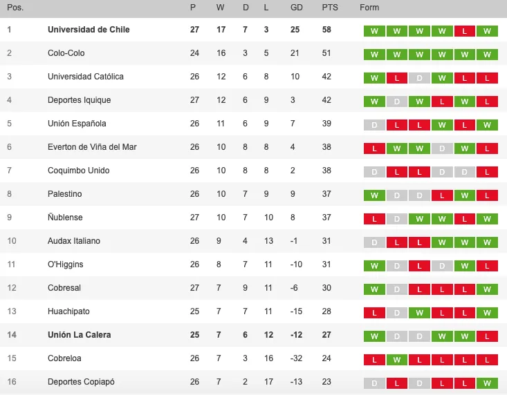 Por su lado, el elenco de La Calera está complicado en el fondo. Para su suerte, aún tiene un partido menos que el resto. Los Cementeros aventajan por cuatro unidades al penúltimo, Cobreloa.