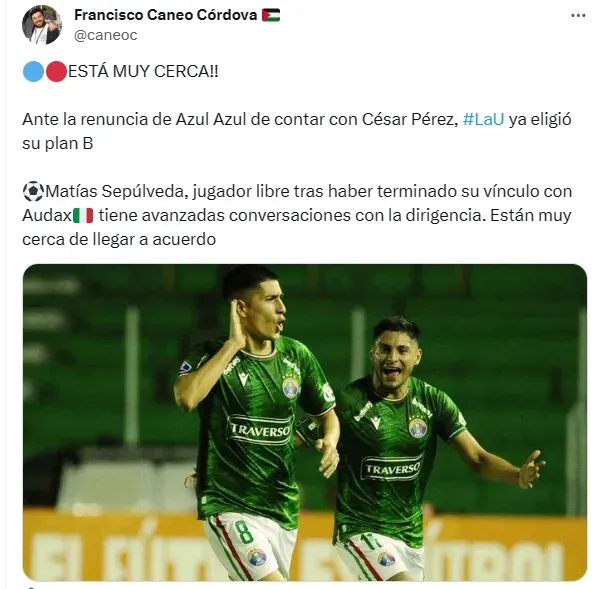 “Matías Sepúlveda, jugador libre tras haber terminado su vínculo con Audax tiene avanzadas conversaciones con la dirigencia. Están muy cerca de llegar a acuerdo”, detalló en sus redes sociales.