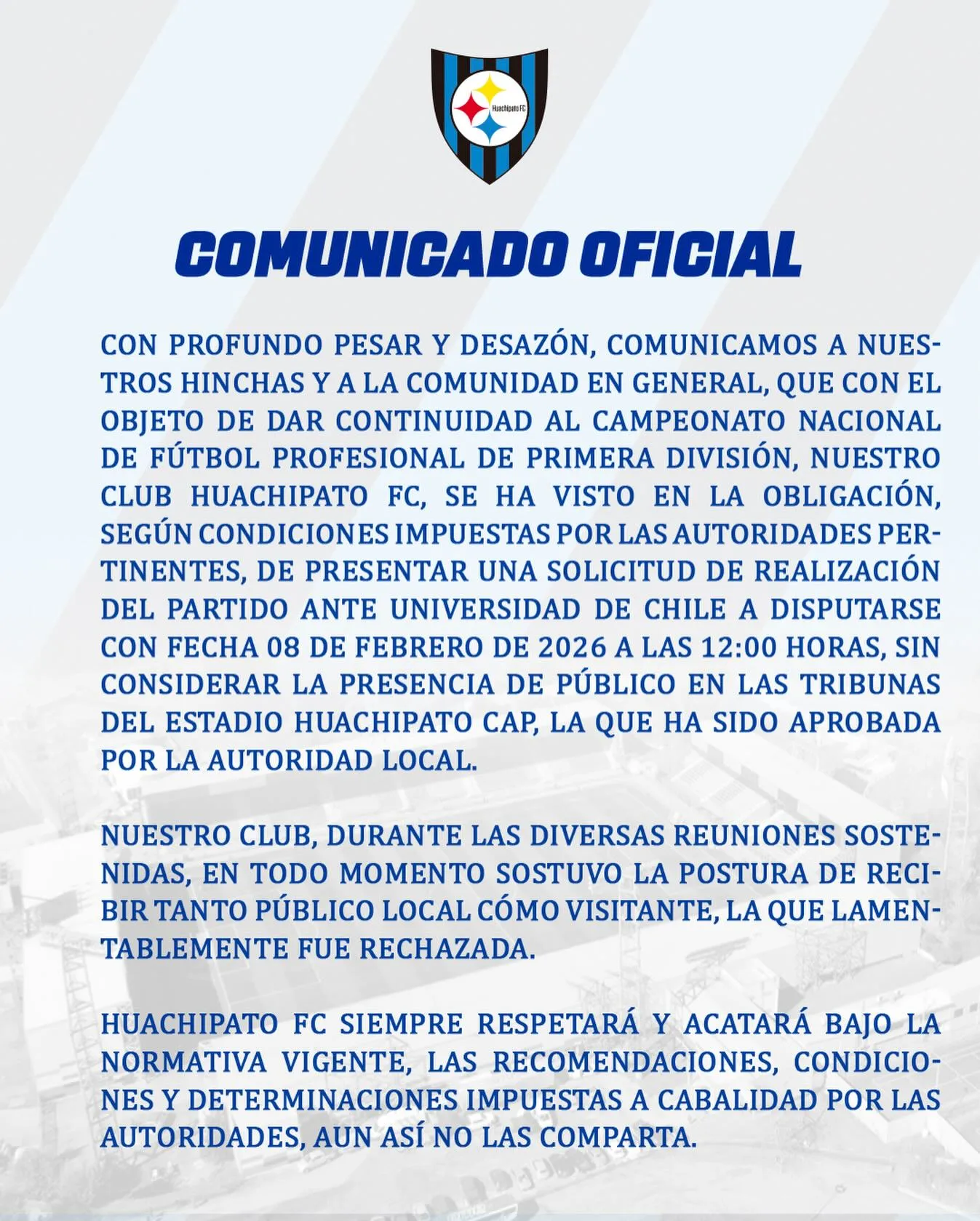 El comunicado cierra señalando que Huachipato respeta y acata la decisión conforme a la normativa vigente, las recomendaciones y las determinaciones impuestas por las autoridades, aunque deja en claro que no comparte dicha resolución.