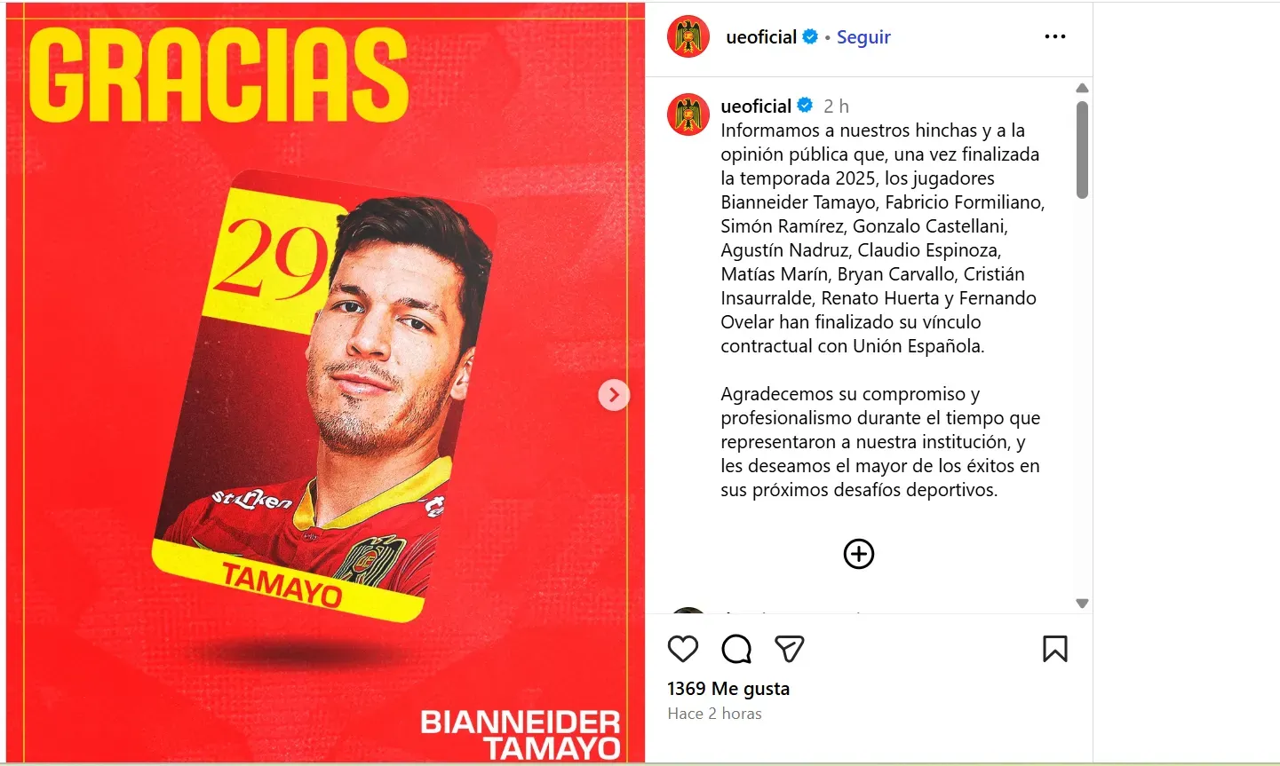 Fue la propia Unión Española quienes confirmaron los jugadores que no van a continuar en su equipo tras el descenso a la Primera B, en una larga lista de nombres.
