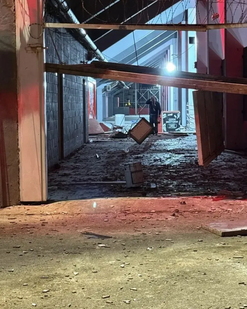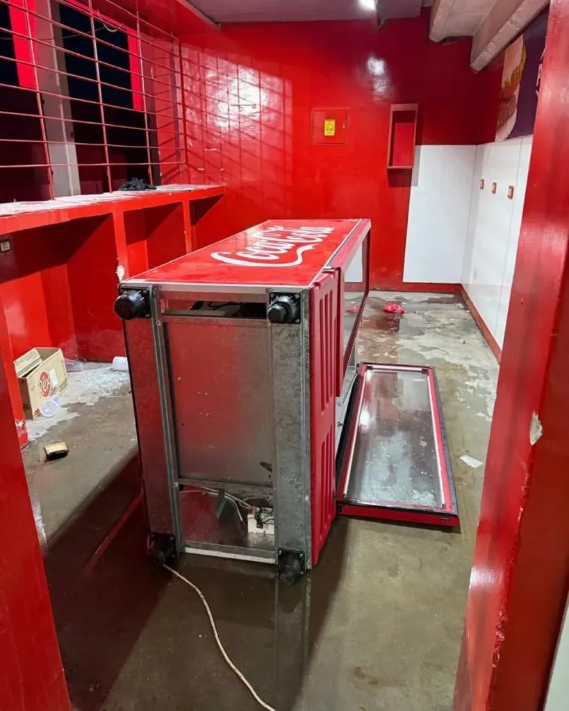 Baños destrozaos, una máquina expendedora de bebidas hecha añicos, fierros por todos lados, trozos de madera y demás fue lo que se pudo presenciar, en lo que perfectamente pudo ser una escena de una verdadera guerra.