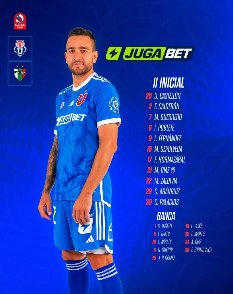 Con esto, Universidad de Chile formará con Gabriel Castellón en la portería; Fabián Hormazábal, Franco Calderón, Matías Zaldivia y Matías Sepúlveda en la defensa; Marcelo Díaz, Charles Aránguiz e Israel Poblete en el mediocampo; Maximiliano Guerrero, Cristián Palacios y Leandro Fernández en la delantera.