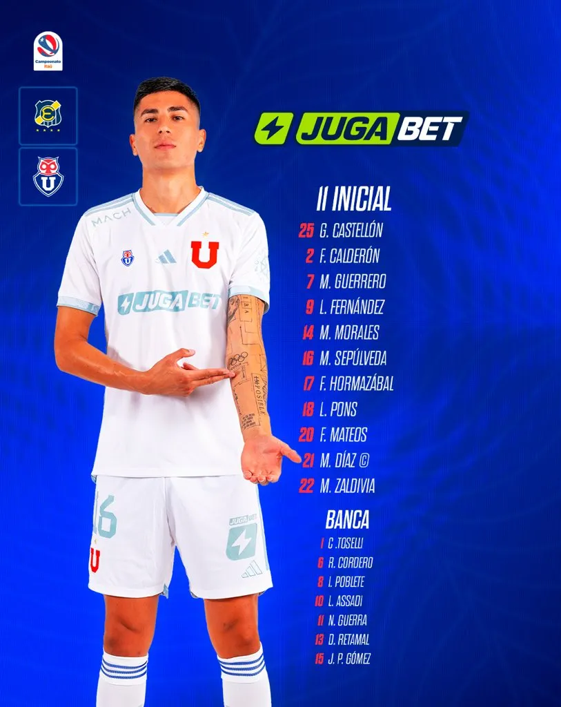 De no mediar contratiempos, la U formará ante Everton con Gabriel Castellón al arco; Fabián Hormazábal, Franco Calderón, Matías Zaldivia y Marcelo Morales en defensa; Marcelo Díaz, Matías Sepúlveda y Federico Mateos en mediocampo; Maximiliano Guerrero, Luciano Pons y Leandro Fernández en ataque.