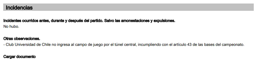 Pero en ese encuentro fueron apuntados por el árbitro en el informe: “Club Universidad de Chile no ingresa al campo de juego por el túnel central, incumpliendo con el artículo 43 de las bases del campeonato”.