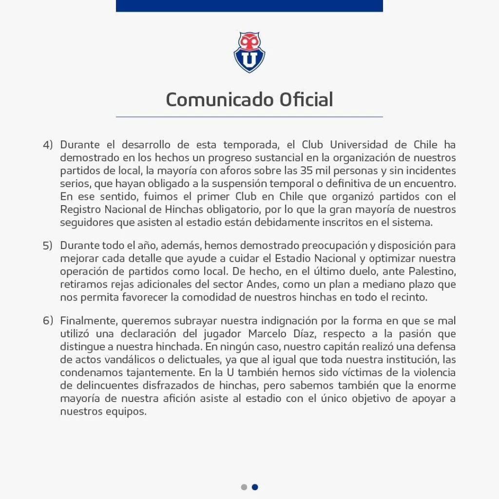 “Queremos subrayar nuestra indignación por la forma en que se mal utilizó una declaración del jugador Marcelo Díaz, respecto a la pasión que distingue a nuestra hinchada. En ningún caso nuestro capitán realizó una defensa de actos vandálicos o delictuales, ya que al igual que toda nuestra institución, las condenamos tajantemente”, golpean la mesa.