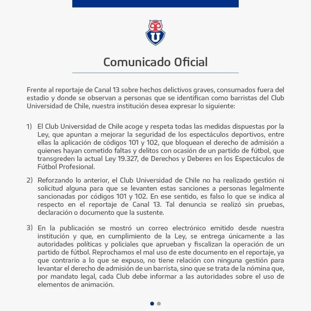 “El club Universidad de Chile no ha realizado gestión ni solicitud alguna para que se levanten estas sanciones a personas legalmente sancionadas por códigos 101 y 102. En ese sentido, es falso lo que se indica al respecto en el reportaje de Canal 13. Tal denuncia se realizó sin pruebas, declaración o documento que la sustente”, explican en el comunicado.