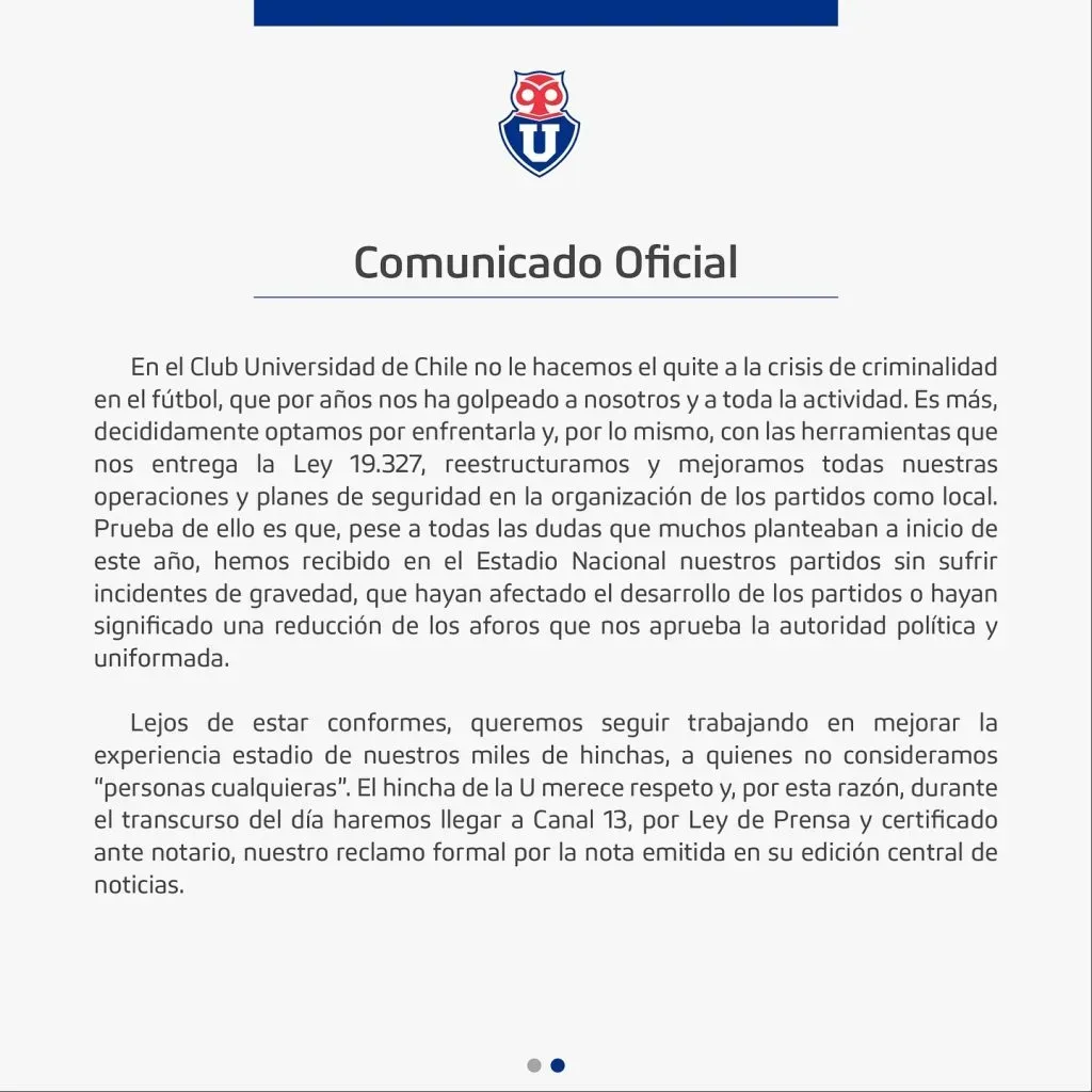 El comunicado sentencia que “lejos de estar conformes, queremos seguir trabajando en mejorar la experiencia estadio de nuestros miles de hinchas, a quienes no consideramos “personas cualquieras”. El hincha de la U merece respeto, y por esta razón durante el transcurso del día haremos llegar a Canal 13, por Ley de Prensa y certificado ante ante notario, nuestro reclamo formal por la nota emitida en su edición central de noticias”.