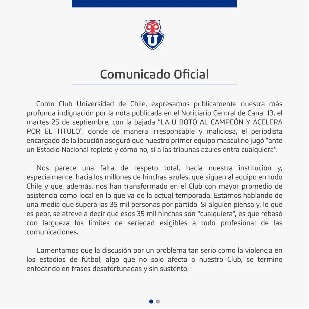 A través de un comunicado, el Chuncho manifestó que “como Club Universidad de Chile expresamos públicamente nuestra más profunda indignación por la nota publicada en el noticiario central de Canal 13, el martes 25 de septiembre, con la bajada “La U botó al campeón y acelera por el título”, donde de manera irresponsable y maliciosa, el periodista encargado de la locución aseguró que nuestro primer equipo masculino jugó “ante un Estadio Nacional repleto y cómo no, si a las tribunas azules entra cualquiera”.