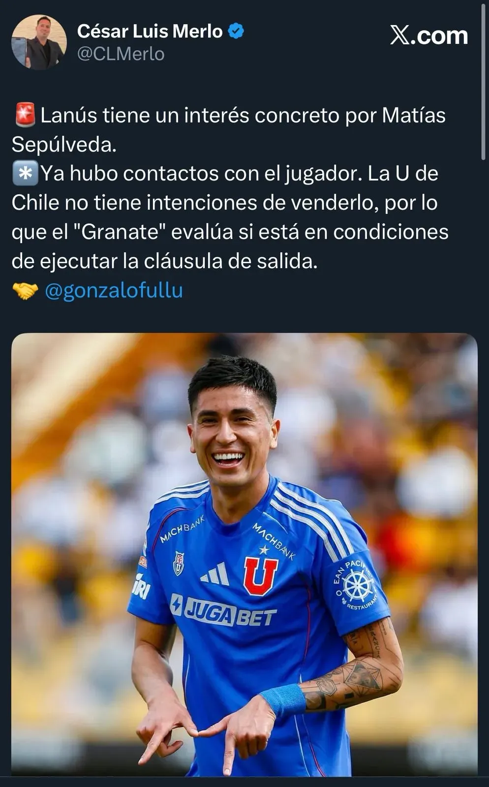 Por lo mismo, el periodista César Merlo analizó la situación en sus plataformas digitales, teniendo en cuenta de que en Argentina lo daban como listo: “Lanús tiene un interés concreto por Matías Sepúlveda”.