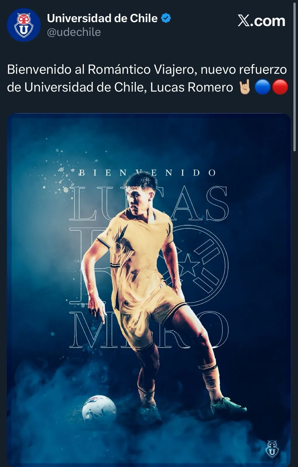 Universidad de Chile ya hizo oficial la llegada de Lucas Romero como se segundo refuerzo para la temporada 2026, con una gran presentación en las redes sociales del club.