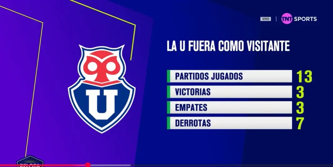 “Dentro de estas tres victorias como visitante que tiene la U, tiene dos en Santiago, que son Palestino en La Cisterna y Unión Española. Esto cambia fuera de Santiago con una victoria a La Calera, dos empates y cinco derrotas”, expuso..