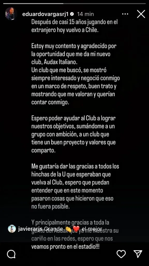 Portazo oficial a U de Chile: Audax Italiano anuncia a Eduardo Vargas como su fichaje estrella