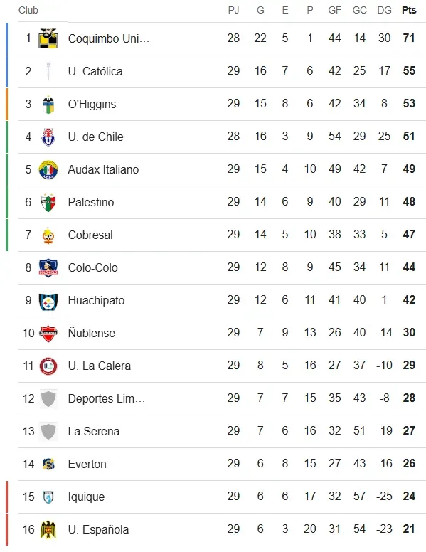 Con el empate la U se queda cuarta en la tabla con 52 puntos, fuera de Copa Libertadores. coquimbo Unido llega a 72 unidades en lo más alto.