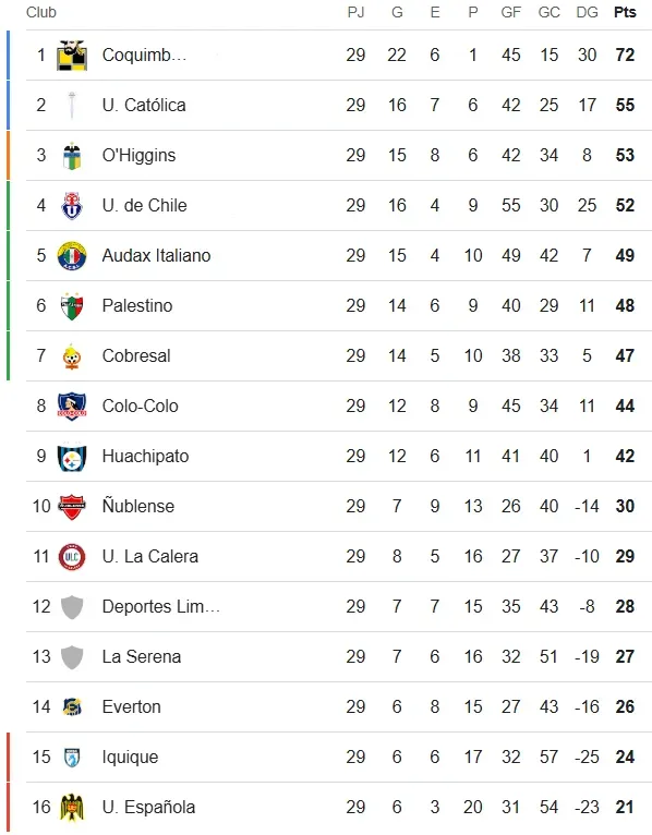 Por su parte, la U no pudo recuperar el tercer lugar y con 52 puntos es cuarto en la tabla, lejos del Chile 2 que ostenta la Católica con 55 unidades, y fuera del Chile 3 que por ahora es de O’Higgins (53′).