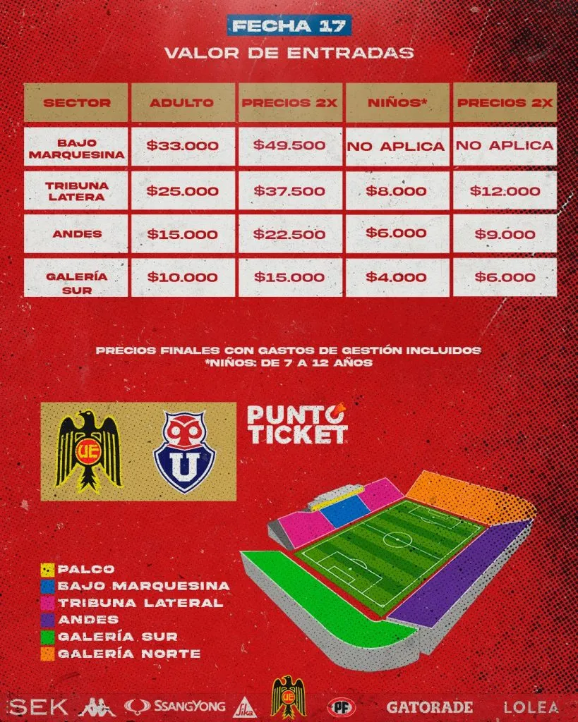 Las localidades para hinchas de la U serán Galería norte, Andes norte y Tribuna lateral, que será habilitado en el mismo sistema de venta.