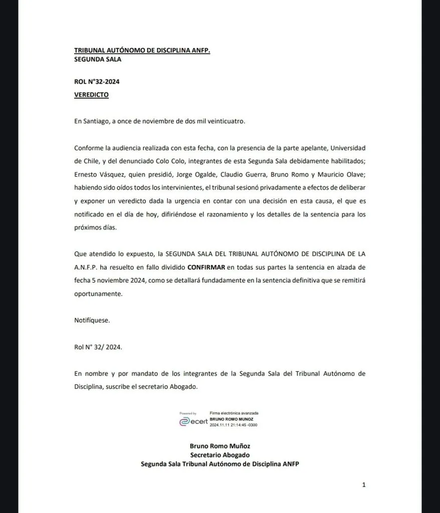 El ente jurídico del fútbol chileno decretó en su fallo inicial que “por votación dividida, de cuatro votos por la posición mayoritaria y dos por la minoritaria, absolver al club denunciado“, al considerar que “no existieron antecedentes probatorios, completos y contundentes que ameritaran imponer las sanciones contempladas en la reglamentación para un eventual desacato”.