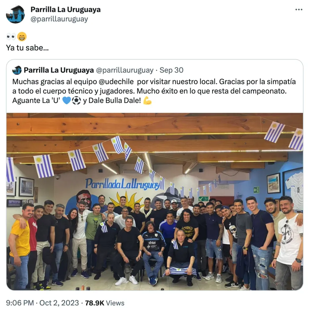 Dos días después, los azules volvieron al triunfo y el restaurante de Juan Araya recompartió la imagen, con la escueta leyenda “ya tu sabes” y emojis de ojos. Ciertamente, Universidad de Chile tendrá que probar ir antes de cada encuentro a comer pamplonas y bifes a La Uruguaya a ver si es su nueva cábala…